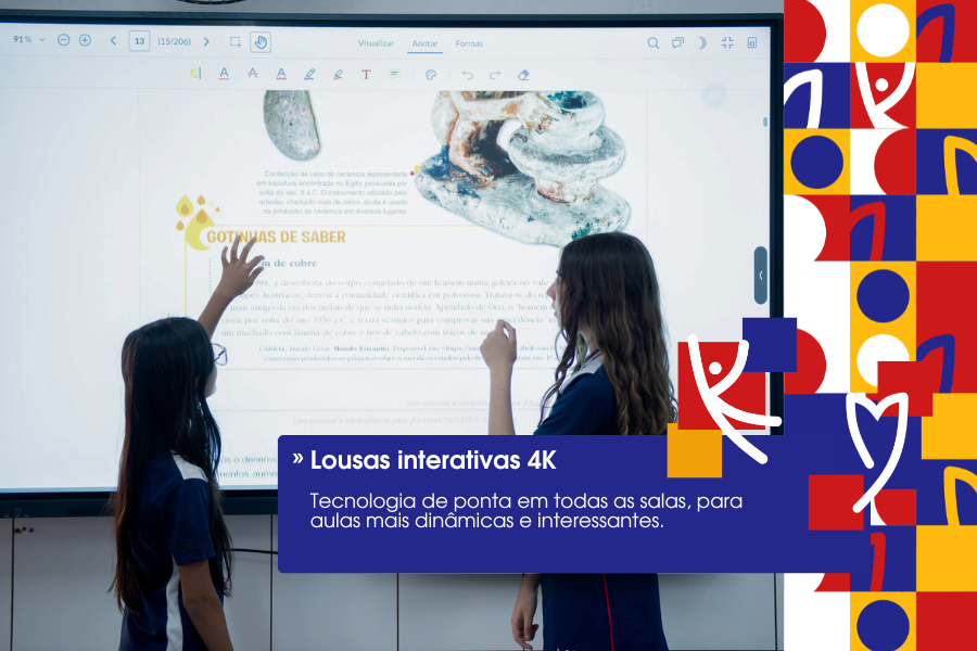 Todas as salas de aula são equipadas com lousas interativas digitais 4K, proporcionando experiências imersivas, dinâmicas e altamente visuais. Esse recurso permite aulas mais envolventes, com conteúdos multimídia que estimulam a participação ativa dos alunos e potencializam o aprendizado.